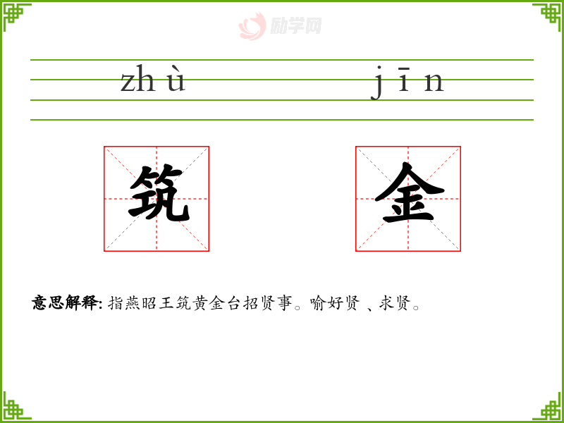 筑金的意思是:指燕昭王筑黄金台招贤事。喻好贤﹑求贤。