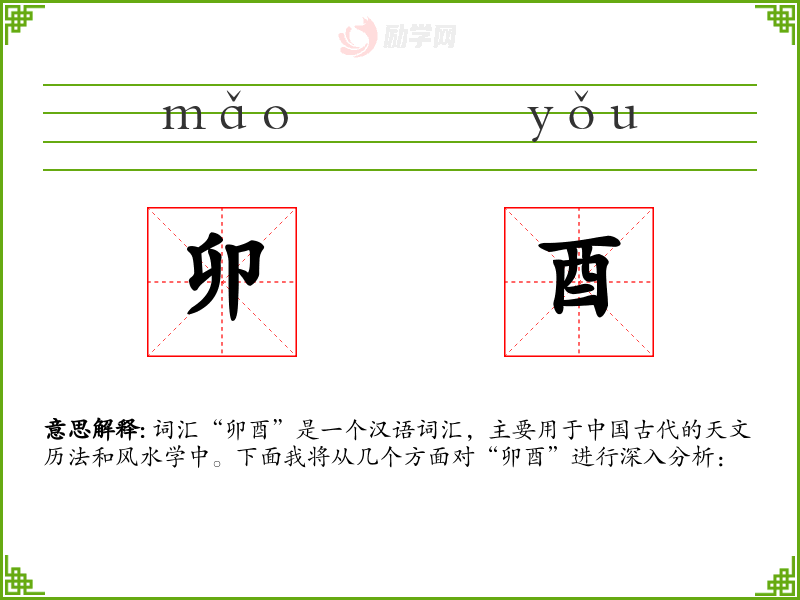 词汇“卯酉”是一个汉语词汇,主要用于中国古代的天文历法和风水学中。下面我将从几个方面对“卯酉”进行深入分析: