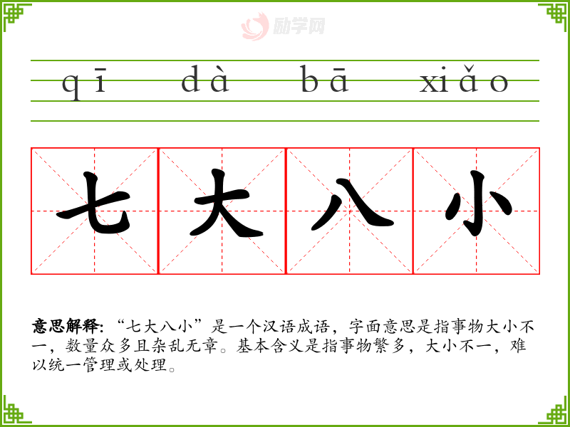 “七大八小”是一个汉语成语,字面意思是指事物大小不一,数量众多且杂乱无章。基本含义是指事物繁多,大小不一,难以统一管理或处理。