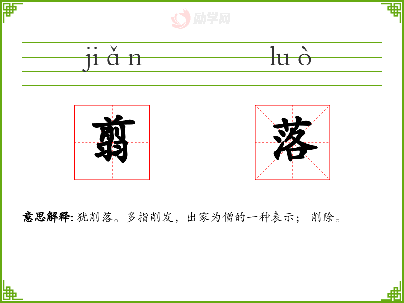 翦落的意思是:犹削落。多指削发,出家为僧的一种表示; 削除。