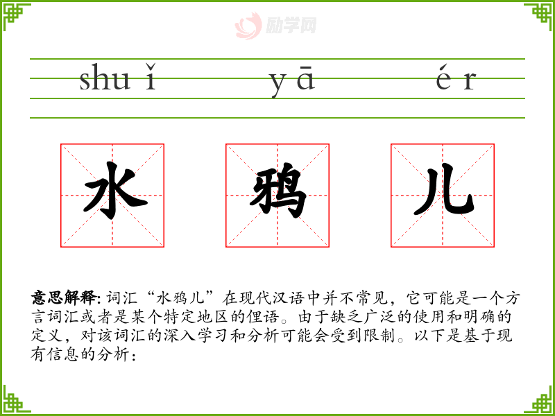 “水鸦儿”这个词汇的含义不明确,可能是一个方言词汇或者是某个特定地区的俚语。由于缺乏广泛的使用和明确的定义,对该词汇的深入学习和分析可能会受到限制。在语言学习和表达中,了解和尊重不同地区的方言和俚语是非常重要的,这有助于我们更好地理解和欣赏语言的多样性。