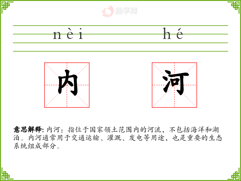 内河:指位于国家领土范围内的河流,不包括海洋和湖泊。内河通常用于交通运输、灌溉、发电等用途,也是重要的生态系统组成部分。