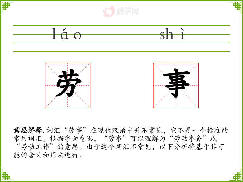 词汇“劳事”在现代汉语中并不常见,它不是一个标准的常用词汇。根据字面意思,“劳事”可以理解为“劳动事务”或“劳动工作”的意思。由于这个词汇不常见,以下分析将基于其可能的含义和用法进行。
