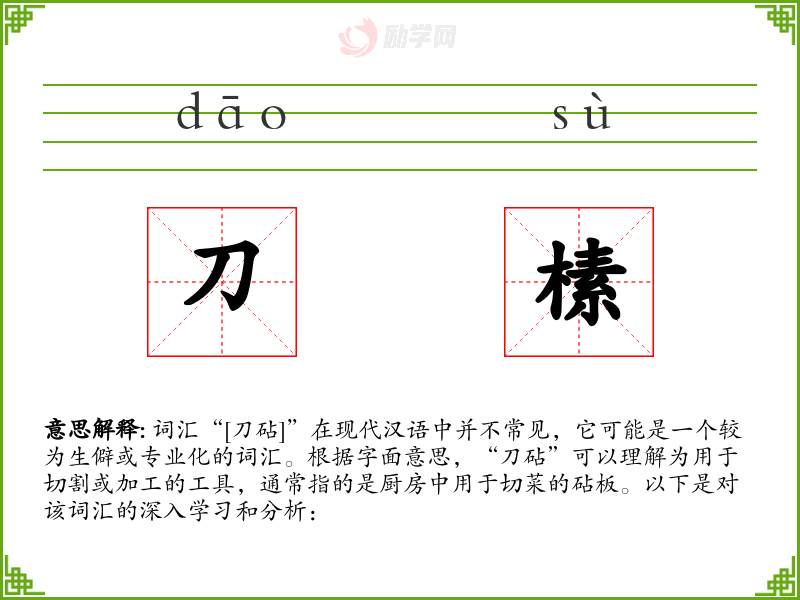 词汇“[刀砧]”在现代汉语中并不常见,它可能是一个较为生僻或专业化的词汇。根据字面意思,“刀砧”可以理解为用于切割或加工的工具,通常指的是厨房中用于切菜的砧板。以下是对该词汇的深入学习和分析: