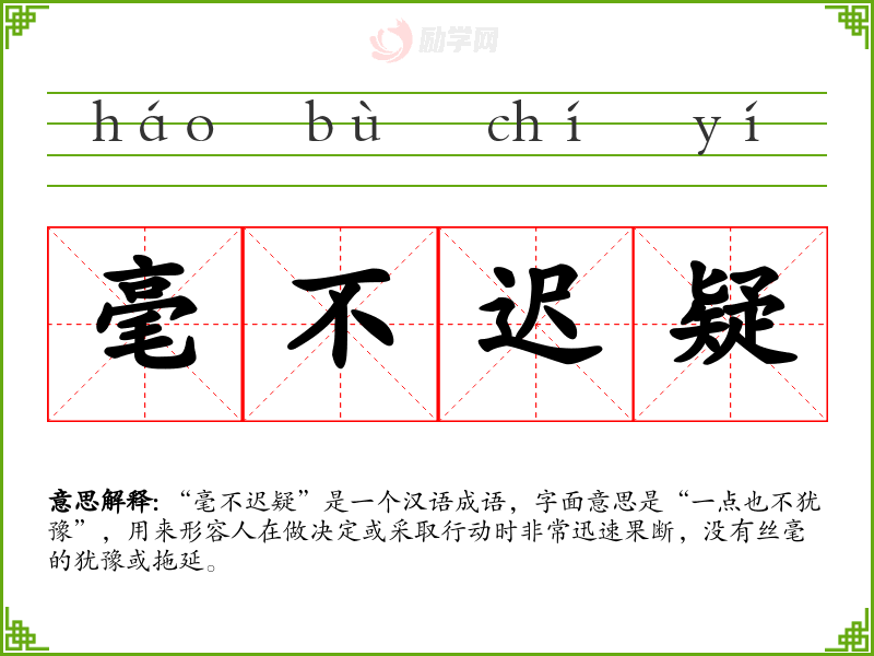 “毫不迟疑”是一个汉语成语,字面意思是“一点也不犹豫”,用来形容人在做决定或采取行动时非常迅速果断,没有丝毫的犹豫或拖延。