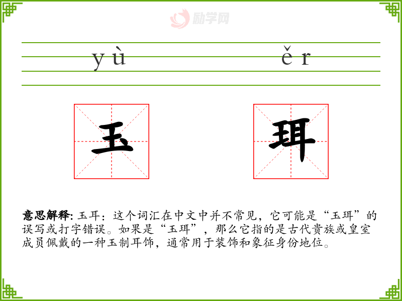 玉耳:这个词汇在中文中并不常见,它可能是“玉珥”的误写或打字错误。如果是“玉珥”,那么它指的是古代贵族或皇室成员佩戴的一种玉制耳饰,通常用于装饰和象征身份地位。