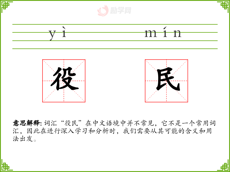 词汇“役民”在中文语境中并不常见,它不是一个常用词汇,因此在进行深入学*和分析时,我们需要从其可能的含义和用法出发。
