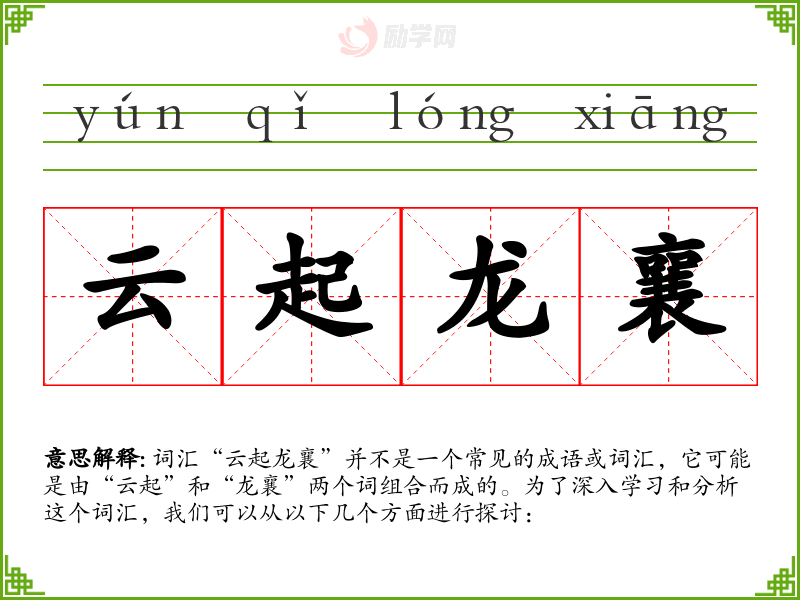 词汇“云起龙襄”并不是一个常见的成语或词汇,它可能是由“云起”和“龙襄”两个词组合而成的。为了深入学*和分析这个词汇,我们可以从以下几个方面进行探讨: