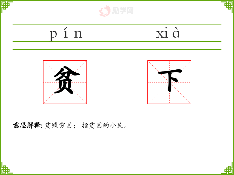贫下的意思是:贫贱穷困; 指贫困的小民。