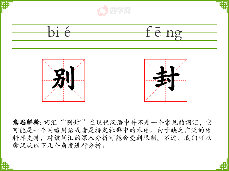 词汇“[别封]”在现代汉语中并不是一个常见的词汇,它可能是一个网络用语或者是特定社群中的术语。由于缺乏广泛的语料库支持,对该词汇的深入分析可能会受到限制。不过,我们可以尝试从以下几个角度进行分析: