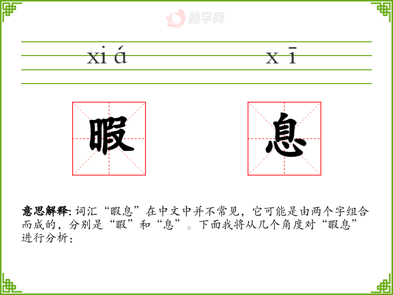 词汇“暇息”在中文中并不常见,它可能是由两个字组合而成的,分别是“暇”和“息”。下面我将从几个角度对“暇息”进行分析: