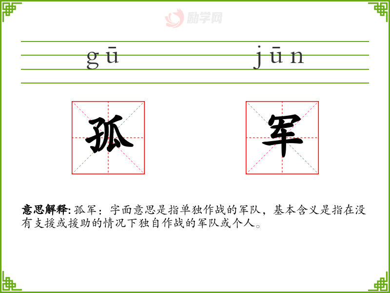 孤军:字面意思是指单独作战的军队,基本含义是指在没有支援或援助的情况下独自作战的军队或个人。