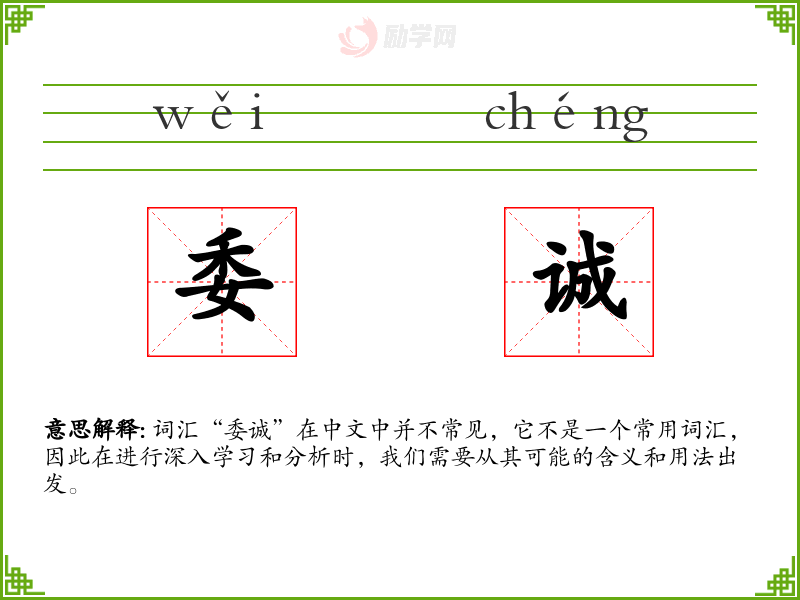 词汇“委诚”在中文中并不常见,它不是一个常用词汇,因此在进行深入学习和分析时,我们需要从其可能的含义和用法出发。