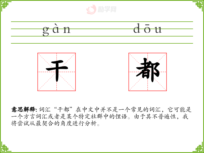 如果“干都”是方言词汇,它可能在某个地区的口语中使用,表达特定的意思。如果是网络用语,它可能出现在特定的社交媒体或网络论坛中,用于表达特定的情感或态度。