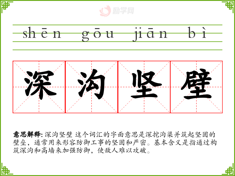深沟坚壁 这个词汇的字面意思是深挖沟渠并筑起坚固的壁垒,通常用来形容防御工事的坚固和严密。基本含义是指通过构筑深沟和高墙来加强防御,使敌人难以攻破。