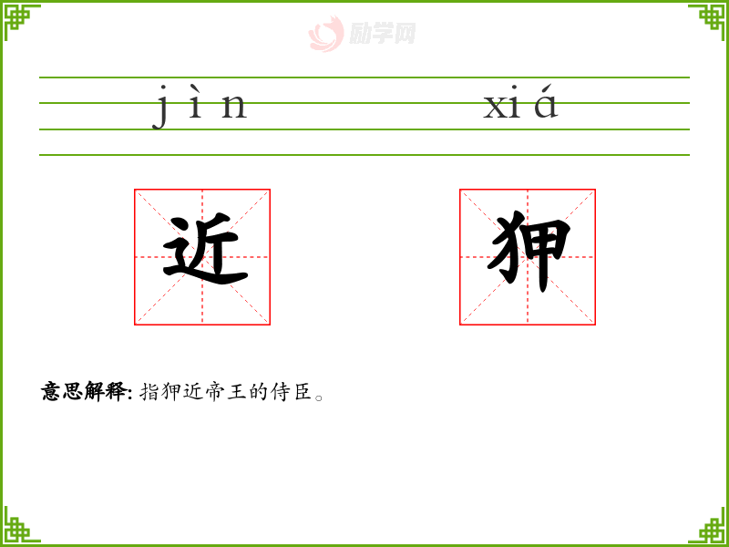 《说文》-近,附也。 《礼记·祭义》-为其近于道也。 《诗·大雅·荡》-小大近丧。 《史记·项羽本纪》-吾入关,秋毫不敢有所近。 唐·柳宗元《三戒》-稍出近之。 清·徐珂《清稗类钞·战事类》-时敌军已近寨。