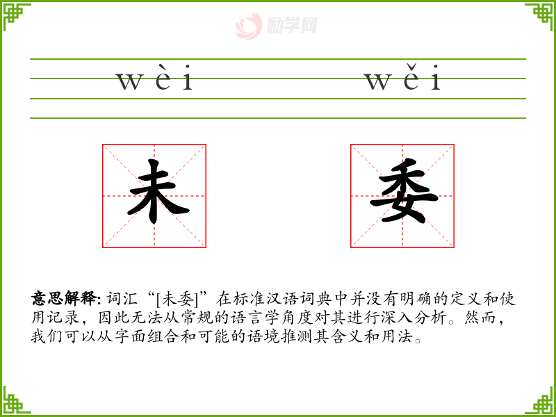 “[未委]”作为一个非标准词汇,其使用和理解需要具体的语境支持。在语言学习和表达中,了解词汇的来源和用法是非常重要的,这有助于更准确地传达思想和情感。