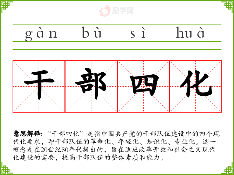 - 同义词:干部现代化、干部素质提升