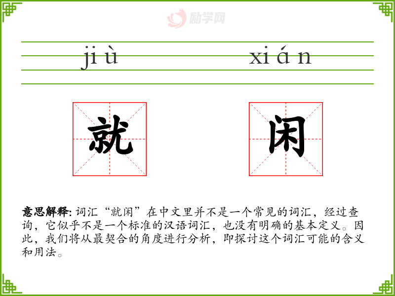 词汇“就闲”在中文里并不是一个常见的词汇,经过查询,它似乎不是一个标准的汉语词汇,也没有明确的基本定义。因此,我们将从最契合的角度进行分析,即探讨这个词汇可能的含义和用法。