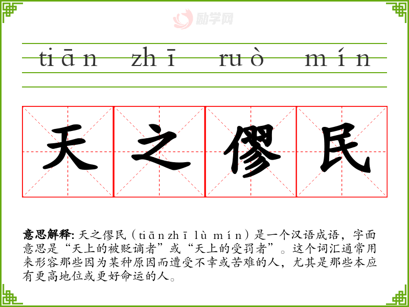 天之僇民(tiān zhī lù mín)是一个汉语成语,字面意思是“天上的被贬谪者”或“天上的受罚者”。这个词汇通常用来形容那些因为某种原因而遭受不幸或苦难的人,尤其是那些本应有更高地位或更好命运的人。