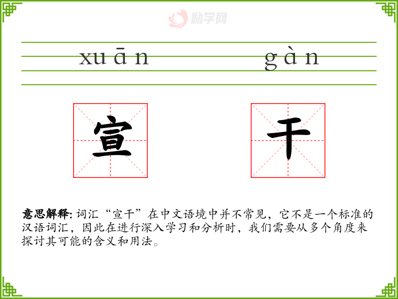 词汇“宣干”在中文语境中并不常见,它不是一个标准的汉语词汇,因此在进行深入学习和分析时,我们需要从多个角度来探讨其可能的含义和用法。