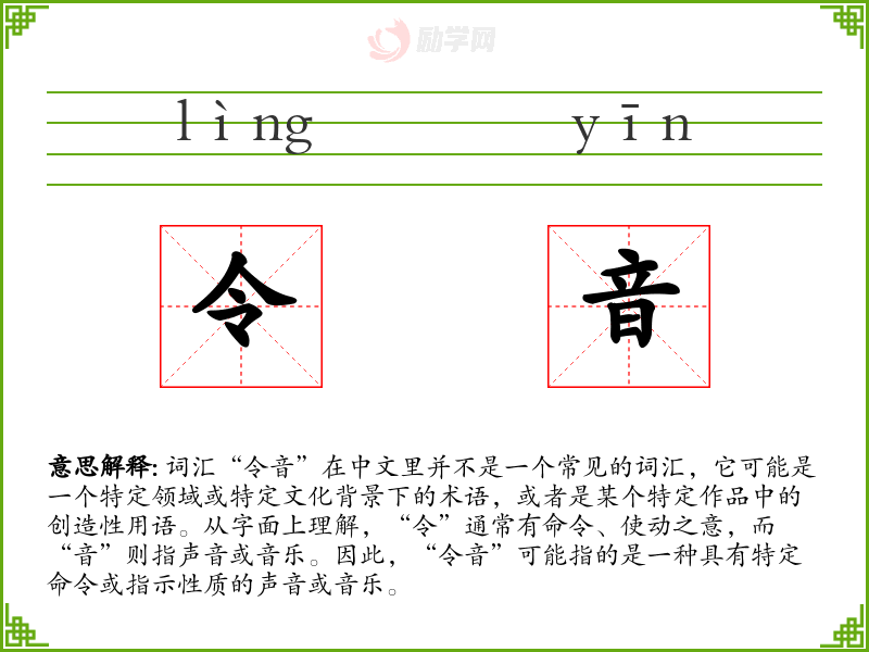 - 反义词:无(由于“令音”不是一个常见词汇,反义词可能不适用)