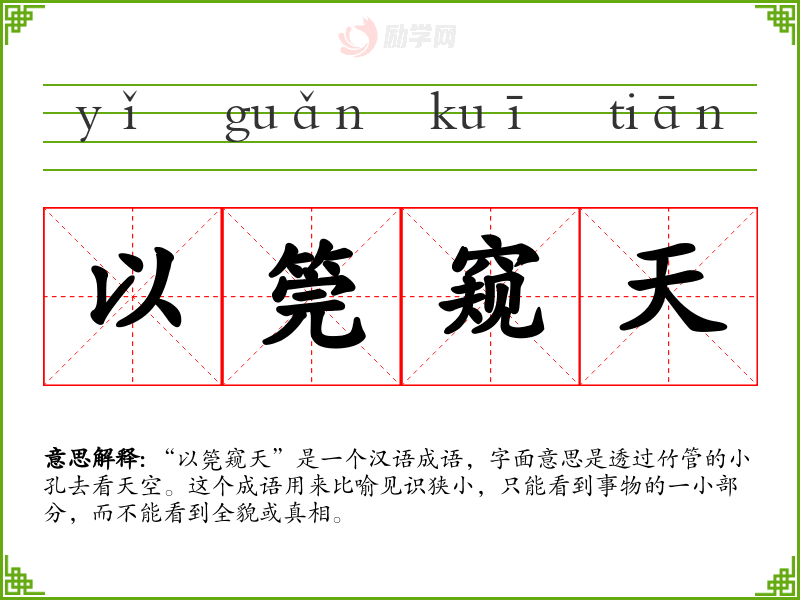 “以筦窥天”这个成语深刻地揭示了认知的局限性,提醒我们在学和生活中要保持开放和全面的视角。在语言学和表达中,理解和运用这样的成语能够丰富我们的表达方式,增强语言的深度和广度。