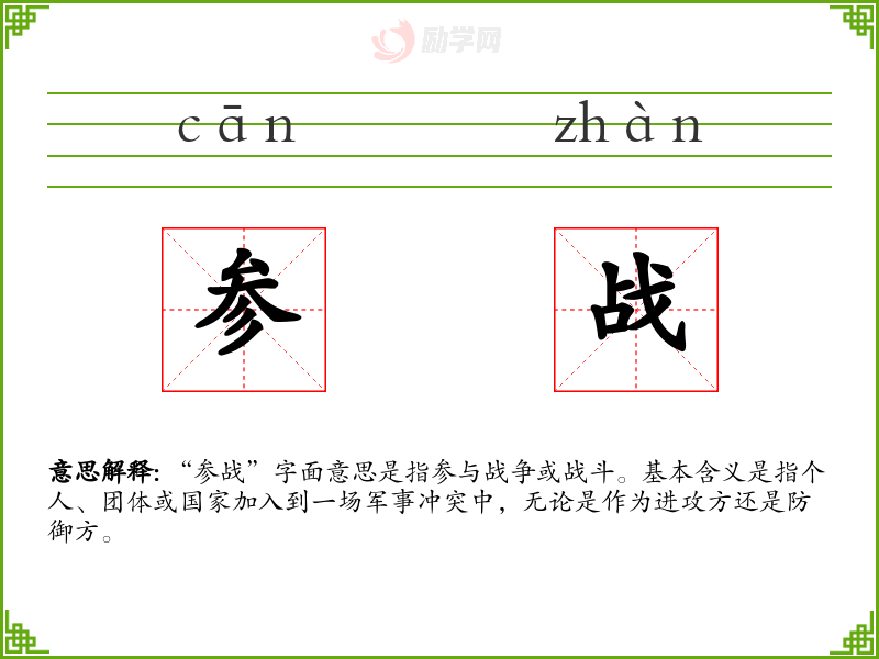 参战的意思是:参加战争或战斗:~国|~部队丨;这场比赛主力队员没有~