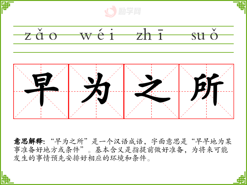“早为之所”是一个汉语成语,字面意思是“早早地为某事准备好地方或条件”。基本含义是指提前做好准备,为将来可能发生的事情预先安排好相应的环境和条件。