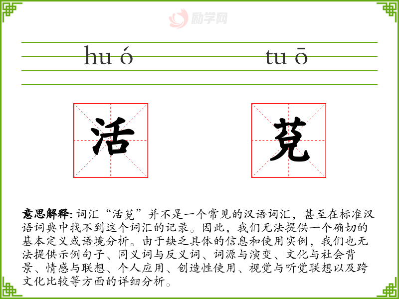 总结来说,对于“活莌”这个词汇,由于缺乏具体的信息和使用实例,我们无法进行深入的分析。这强调了在语言学习中,准确性和恰当性的重要性,以及在遇到不熟悉的词汇时应该采取的谨慎态度。