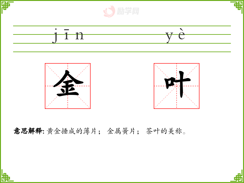 金叶的意思是:黄金捶成的薄片; 金属簧片; 茶叶的美称。