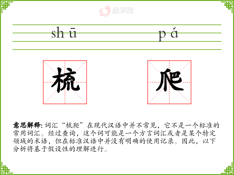 由于“梳爬”不是一个标准词汇,我们无法提供确切的分析和总结。在语言学习和表达中,了解和使用标准词汇是非常重要的,这有助于清晰和有效地沟通。对于不常见的词汇,我们应该谨慎使用,并在必要时提供明确的定义和上下文。