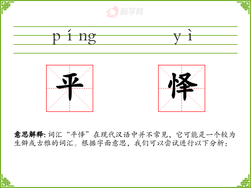 词汇“平怿”在现代汉语中并不常见,它可能是一个较为生僻或古雅的词汇。根据字面意思,我们可以尝试进行以下分析: