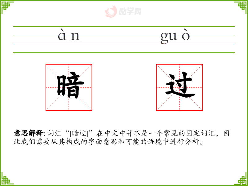 词汇“[暗过]”在中文中并不是一个常见的固定词汇,因此我们需要从其构成的字面意思和可能的语境中进行分析。