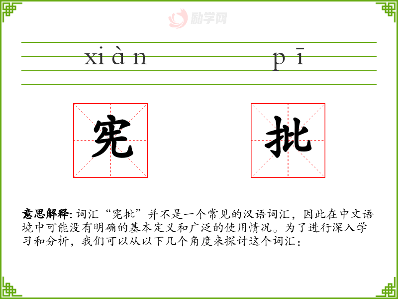 由于“宪批”不是一个标准词汇,我们无法提供一个确切的字面意思和基本含义。它可能是某个特定领域或社群中的术语,或者是某个特定语境下的缩写或简称。
