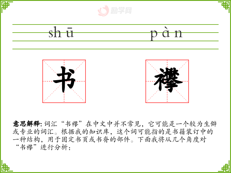 词汇“书襻”在中文中并不常见,它可能是一个较为生僻或专业的词汇。根据我的知识库,这个词可能指的是书籍装订中的一种结构,用于固定书页或书脊的部件。下面我将从几个角度对“书襻”进行分析:
