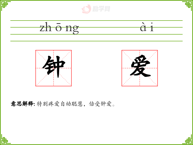 钟爱的意思是:特别疼爱自幼聪慧,倍受钟爱。