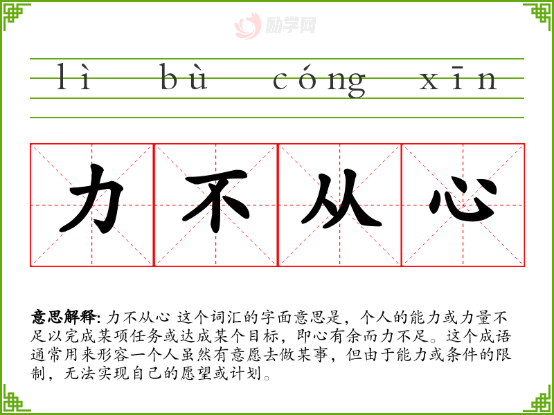 力不从心 这个词汇的字面意思是,个人的能力或力量不足以完成某项任务或达成某个目标,即心有余而力不足。这个成语通常用来形容一个人虽然有意愿去做某事,但由于能力或条件的限制,无法实现自己的愿望或计划。