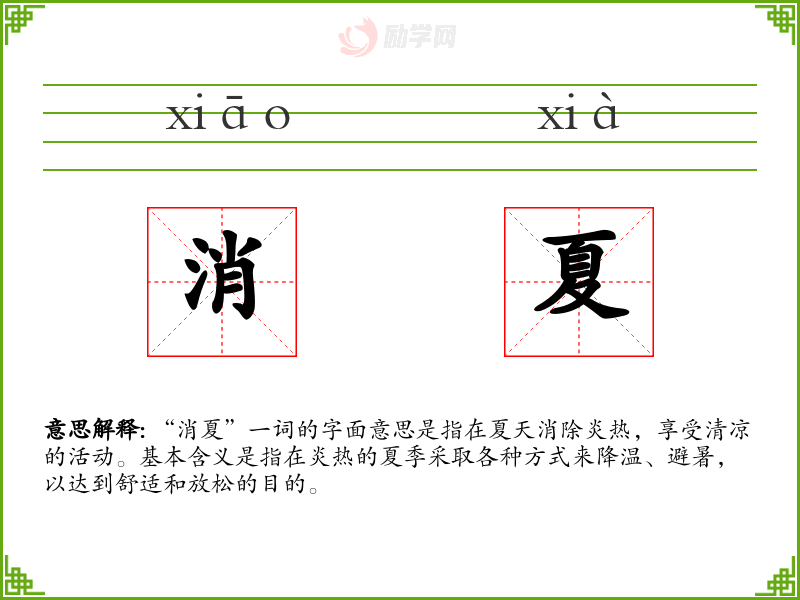 “消夏”一词的字面意思是指在夏天消除炎热,享受清凉的活动。基本含义是指在炎热的夏季采取各种方式来降温、避暑,以达到舒适和放松的目的。