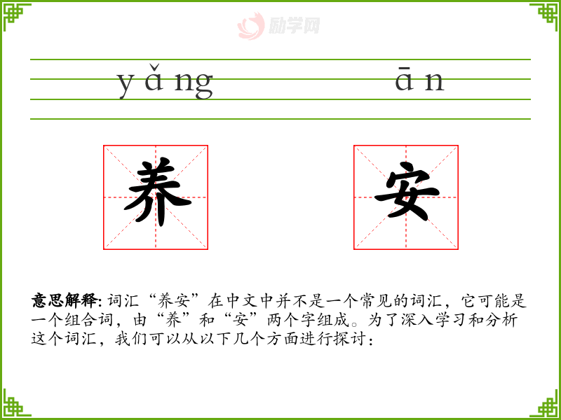 - 字面意思:“养”通常指抚养、培养、滋养等意思,而“安”则有安定、安全、安宁等含义。