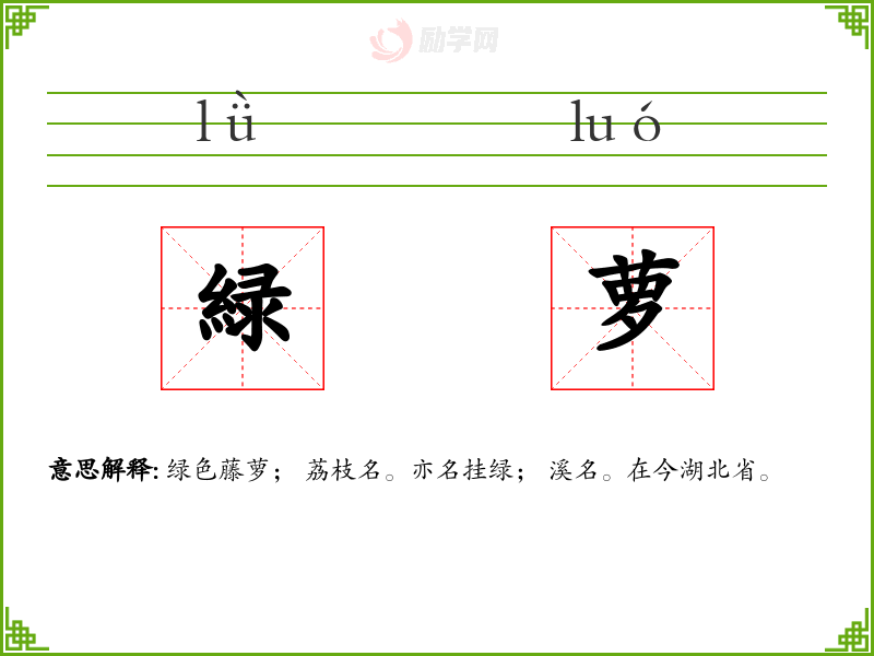 緑萝的意思是:绿色藤萝; 荔枝名。亦名挂绿; 溪名。在今湖北省。