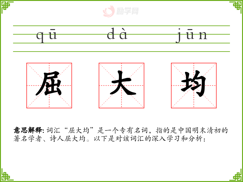词汇“屈大均”是一个专有名词,指的是*明末清初的著名学者、诗人屈大均。以下是对该词汇的深入学和分析: