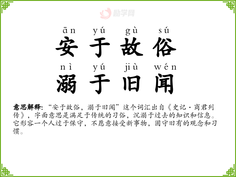 “安于故俗,溺于旧闻”这个词汇出自《史记·商君列传》,字面意思是满足于传统的俗,沉溺于过去的知识和信息。它形容一个人过于保守,不愿意接受新事物,固守旧有的观念和惯。