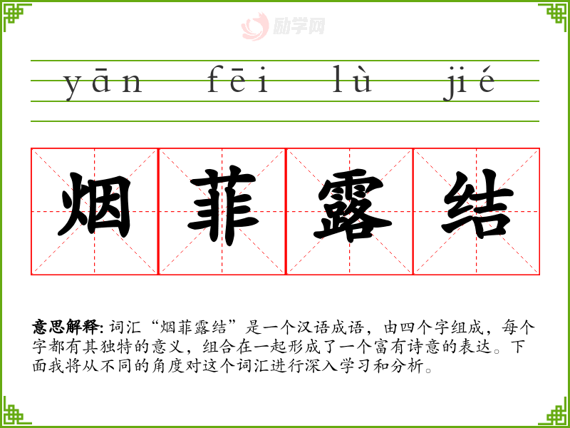 词汇“烟菲露结”是一个汉语成语,由四个字组成,每个字都有其独特的意义,组合在一起形成了一个富有诗意的表达。下面我将从不同的角度对这个词汇进行深入学*和分析。