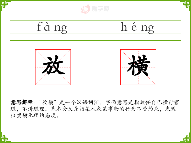 “放横”是一个汉语词汇,字面意思是指放任自己横行霸道,不讲道理。基本含义是指某人或某事物的行为不受约束,表现出蛮横无理的态度。