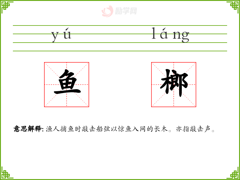 鱼榔的意思是:渔人捕鱼时敲击船弦以惊鱼入网的长木。亦指敲击声。