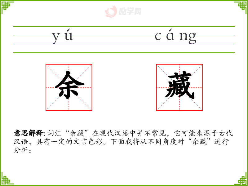 词汇“余藏”在现代汉语中并不常见,它可能来源于古代汉语,具有一定的文言色彩。下面我将从不同角度对“余藏”进行分析: