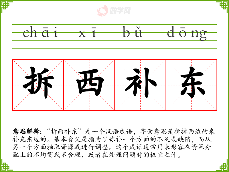 “拆西补东”是一个汉语成语,字面意思是拆掉西边的来补充东边的。基本含义是指为了弥补一个方面的不足或缺陷,而从另一个方面抽取资源或进行调整。这个成语通常用来形容在资源分配上的不均衡或不合理,或者在处理问题时的权宜之计。