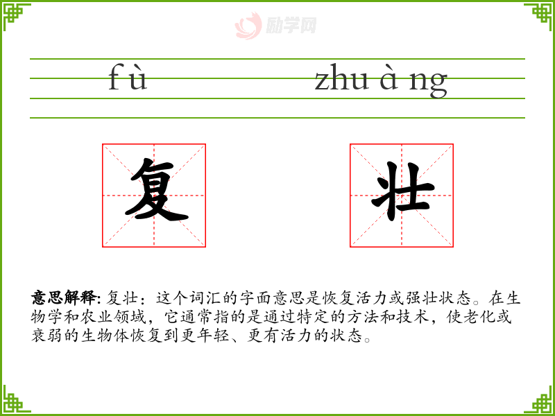 “复壮”一词的词源较为直接,由“复”(恢复)和“壮”(强壮)两个字组成。在古代汉语中,类似的表达可能更为具体,如“恢复元气”等。随着时间的推移,“复壮”逐渐被广泛应用于描述生物体或组织的恢复过程。