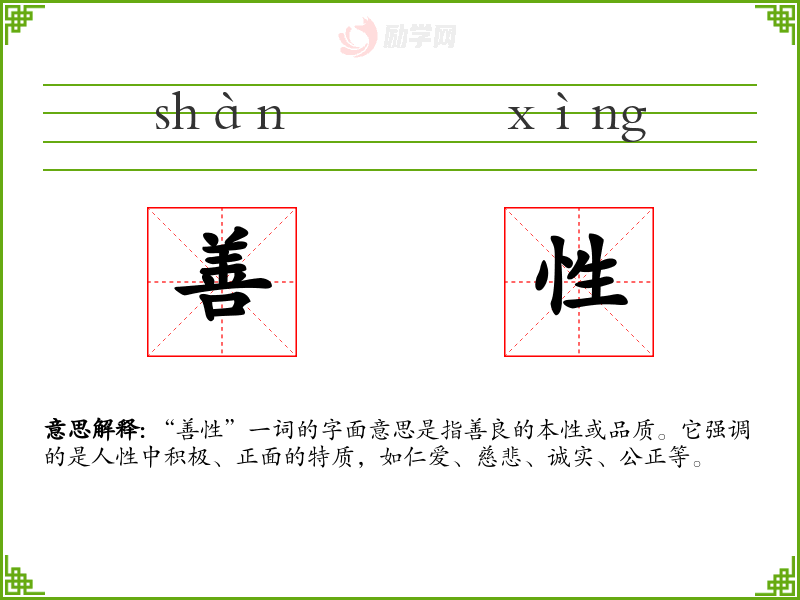 善性的意思是:谓人善良的本性。语本《孟子.告子上》"人性之善也,犹水之就下也。"又"此天之所与我者,先立乎其大者"汉赵岐注"谓生而有善性也。"
